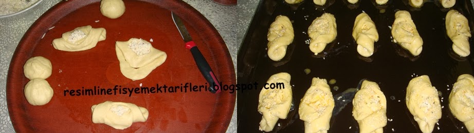 • Hamur mayalanır bezeler alınır. Resimde gördüğünüz gibi şekilleri yaparsınız. Açtığınız hamura iki kesik atarsınız birbirinin içinden geçirirsiniz.Poğaçalar yapıldıktan sonra yağlanmış tepsiye dizilir üzerine yumurta sürülür üzerine susam ekilir.170 derecelik fırında üstü kızarana kadar pişirilir.