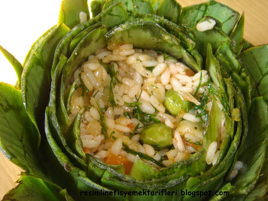 • Enginarları teker teker iç ile doldururuz ve pişirme kabına yerleştiririz,enginarların üzerinden pirinçler de su alacak şekilde kaynar su eklenir, kaynara çıkınca ocağın altı kısılır ve pişirmeye devam edilir.Ben düdüklüde yaklaşık 25 dakikada pişirdim normal tencerede bu süre daha uzun olacaktır.